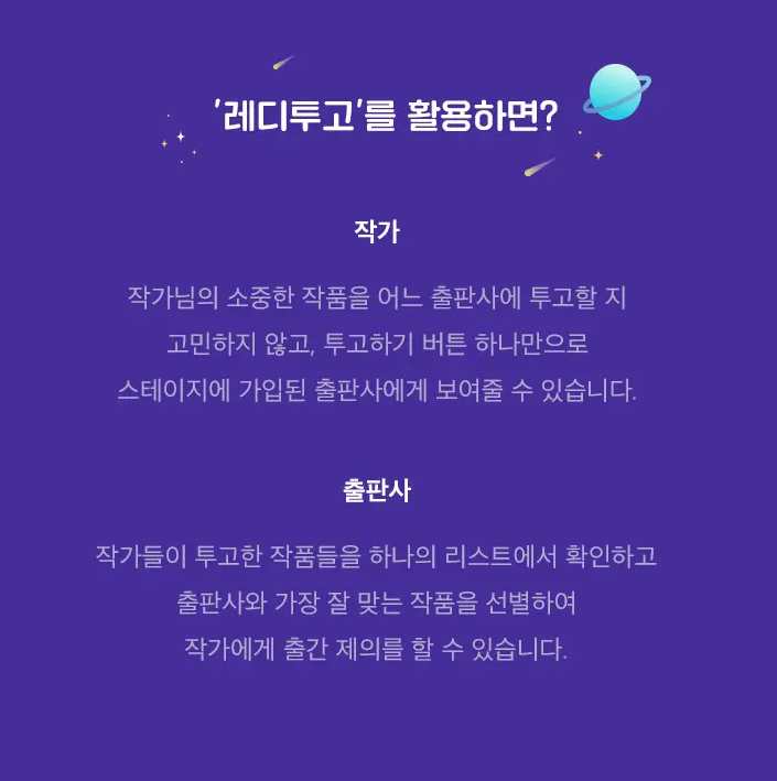 재능 있는, 출간을 노리는 작가님들이나 출판사분들이 참여하는 활기찬 장이 되었으면 좋겠네요.