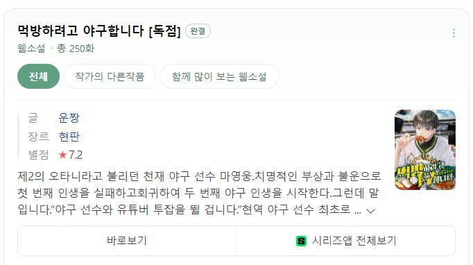 운짱 작가님의 "먹방하려고 야구합니다" 야구 현대판타지 소설 작품 리뷰입니다.
