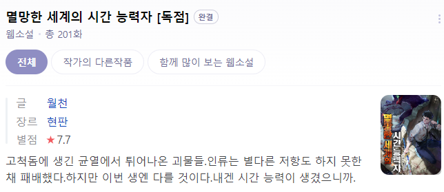 밀리터리 현대 판타지 소설, 월천의 멸망한 세계의 시간 능력자 작품 리뷰였습니다.