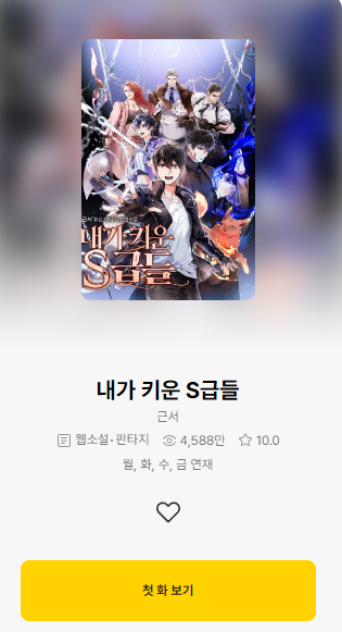 근서 작가님의 "내가 키운 S급들" 작품 리뷰입니다. 850화..외전 등등 끼우면 900화에 가까운 초장편이지만 나는 중반까지 보다가 하차. 전체적으로는 완전 나쁜 느낌은 아닌데 너무 과하다고 해야하나? 어떤 면에선 조금 고구마 스럽기도하고...