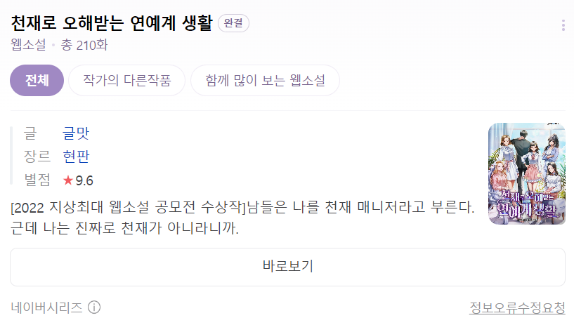 글맛 작가님의 천재로 오해받는 연예계 생활 작품 리뷰입니다. 괜히 별점 9.6점에, 지상최대 웹소설 공모전 수상작이 아니네요. 이런 이력은 모르고 봤고, 생각보다 굉장히 재밌게 보고 이 리뷰를 작성하려고 보니깐 이런 이력이 있었네요. 개인적으로는 이런 현대판타지, 특히 연예계 매니지먼트물은 좀 비주류 장르이고 또 그만큼 한정된 독자들이 이미 수작들을 많이 본 상태라 기준점도 높다고 생가하는데 그런 단점들을 다 뛰어넘을 정도로 상당히 재미있었습니다.