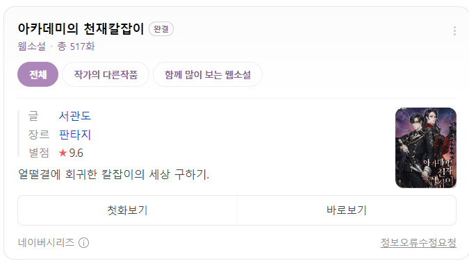 웹툰화까지 되어 있나 보군요. 서관도 작가님의 아카데미의 천재칼잡이 리뷰입니다.