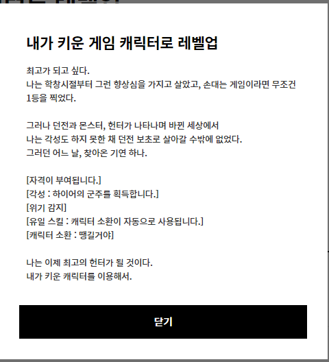 김동혁 작가님의 "내가 키운 게임 케릭터로 레벨업" 카카오 스테이지 연재분 리뷰입니다.