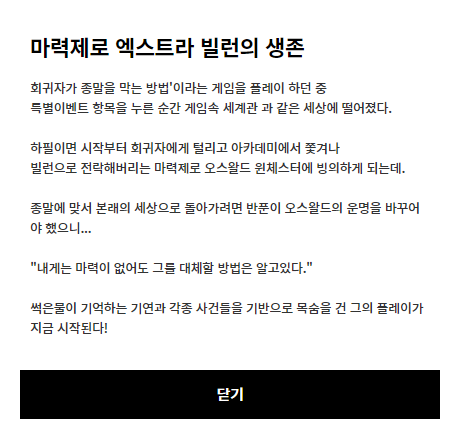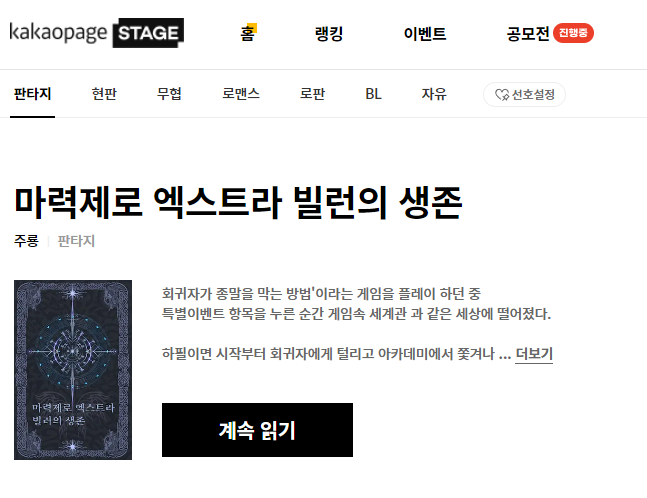 카카오스테이지 주룡 작가님의 "마력제로 엑스트라 빌런의 생존" 리뷰입니다.